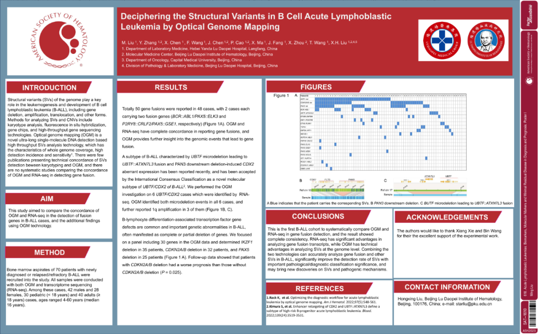 编者按:第65届美国血液学会(ASH)年会日前在美国圣迭戈(San Diego)圆满召开。作为全球血液学领域规模最大、涵盖最全面的国际学术盛会之一,吸引了来自世界各地的知名专家学者,分享、交流血液学疾病最新基础前沿、新治疗手段及方案、疾病管理策略等。在本次大会上,陆道培医院刘红星教授团队的多项研究入选壁报展示,本期给大家带来的是其中之一(摘要号:1610),该研究评估了光学基因组图谱(OGM)技术在初诊和复发B细胞淋巴细胞白血病(B-ALL)患者基因组结构变异分析中的应用。